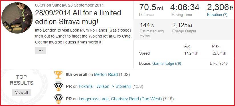 Another quick photo to prove my journey, flash of the pics to the friendly Giro staff and I had my mug! It was a fantastic ride and well worth the effort. I especially enjoyed meeting up with the Woking CC crew, who were also in Giro Cafe for their Sunday club ride stop! I clocked a shade over 70 miles and even managed to transport the beautiful looking mug safely home in my middle jersey pocket (not idea).