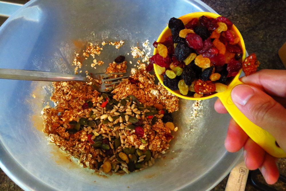 I modified mine slightly by mashing two bananas and adding half a cup of seed/nut mix with half a cup of dried fruit. It sweetens up the bars a little. I would have preferred just cranberries but I only had that pre-mixed dried fruit packet in the house.