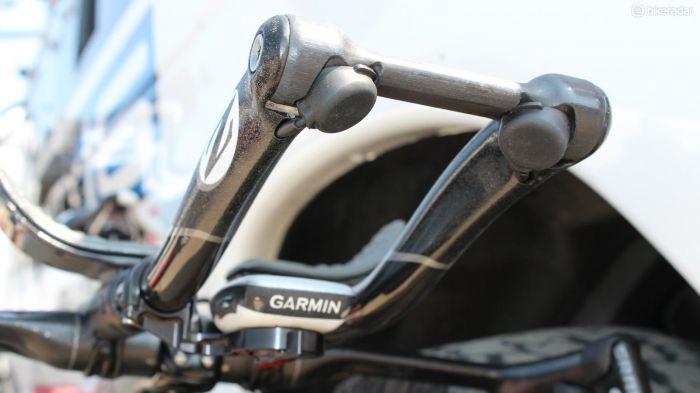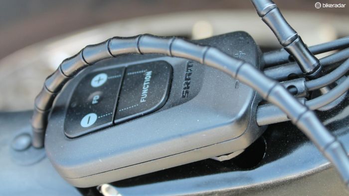From the photos released on Bike Radar it looks like the shift buttons on the extensions and base bars connect via wires (yes, I know) to a junction box, which then transmits the signals wirelessly to the front and rear derailleurs. The junction box also has it’s own buttons, but it’s still unclear what these are for (looks to me to be another shift point although I’m not sure why you’d want or need them there).