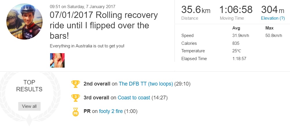 It was a fun ride. Well, it was until a bird flapped out of a roadside bush and collided with my chest! I must have grabbed too much front brake or turned abruptly as I was sent over the bars and hit the bitumen! Luckily nothing broken (on me, the bike or the bird) just a few grazes and some scuffed levers.