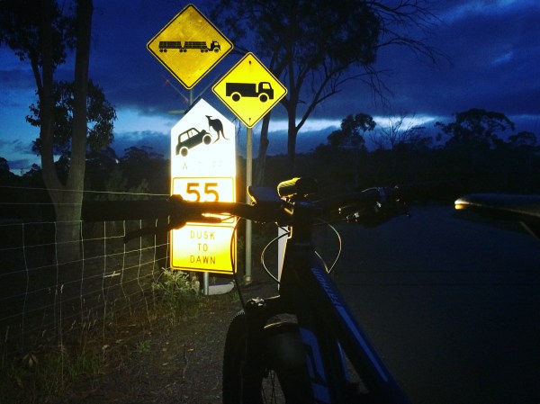 There are no cars to bother me, only the wallabies bouncing alongside the trail to keep me company. Every so often they dart out into the beam of my front light. At full-on road bike speeds it’d be too dangerous to venture out at night, but on the mountain bike it’s alright. The crunch of my cushy 2.2 inch tyres rolling along the gravel gives the wildlife a heads up too.