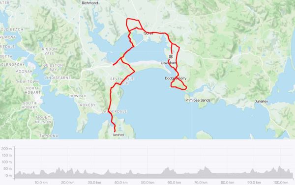 Because of the last-minute decision, I didn’t really have much of a plan apart from “pedal until I hit the metric century.” June is the beginning of winter here in Tasmania. The long thermal bibs and long sleeve jersey had to be dug out of the cupboard for this one! I’m not quite as “hard” as I used to be either, so I waited until the frost had melted before donning my kit and heading out the door.