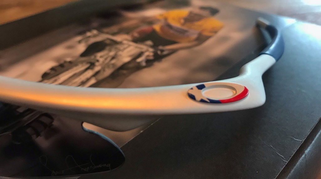 They’ll go perfectly with my US POSTAL team kit on the Trek 5200! Sure, nobody but me is going to notice or even realise they’re “period correct” but that’s not the point. I’ll know. Check out the Texas flag Oakley logo too, it’s the small details that make the difference!