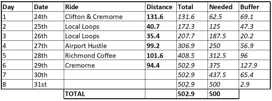 Making it back to the carpark alive and upright got me a total of 502km with two days to spare! It was a fast final ride so I was pretty sure I’d beaten last year’s time too. I’d pushed as hard as my fatigued legs had let me over the distance. Looking at my stats on Strava I was stoked to see I had cut over half an hour off last year’s total time – and with more elevation gain!