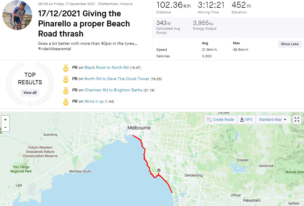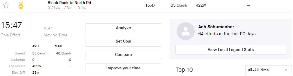 Looking closer, there’s also my PR on the “Black Rock to North Rd” segment. I clocked this one at 35km/hr which gave me a Strava power value of 422 watts for over 15 minutes! BOOM! But let’s be honest here, in reality I can hold 400 watts for all of about thirty seconds…