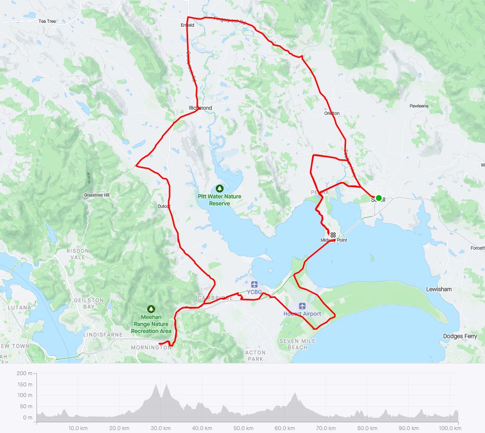 Apparently that wasn’t quite enough sugar as the second half of the ride was a struggle! My legs felt a little “blunt” and just not up to any harder efforts. I wasn’t falling off the back of the bunch, but I certainly wasn’t pushing the pace at all. Thankfully we had a good post-bakery group and we swapped turns to share the load over the final 40km. Around the 85km mark, the sun finally burnt through the morning chill so I swung off from the bunch as they headed back to Hobart, then tacked on an additional loop to bring up the hundred. I was done. It was a low-key soft pedal back to the car with very little left in the tank.