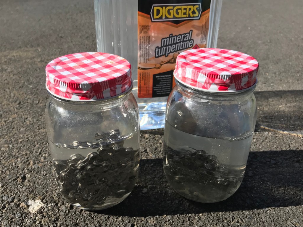 2) It may not be hard, but it can be time consuming. Waxing does take more time compared to squirting on some lube from a bottle. If you are time-poor, then waxing is probably not for you! The initial stripping of a new chain (or a pre-used chain) using mineral turpentine and methylated spirits is a bit of a chore, but thankfully you only need to do it once. New chains all come with a factory coating. This has to be completely stripped away before waxing. If not, the hot melt wax will not penetrate the chain. To save on time I cleaned two chains at once. Soak, shake, pour, repeat, etc.