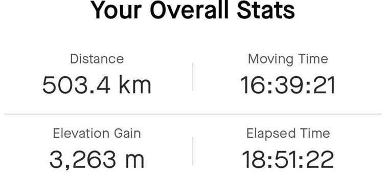 I do like to ride most of the Festive 500 solo as it’s more time efficient, and I did want to see if I could complete the 500km in under 20 hours total elapsed time. That works out to an average elapsed speed, including any stops, of 25km/hr. I got there with a little over an hour to spare. My average riding speed for the 500km was 30.2km/hr. I’m pretty happy with that.