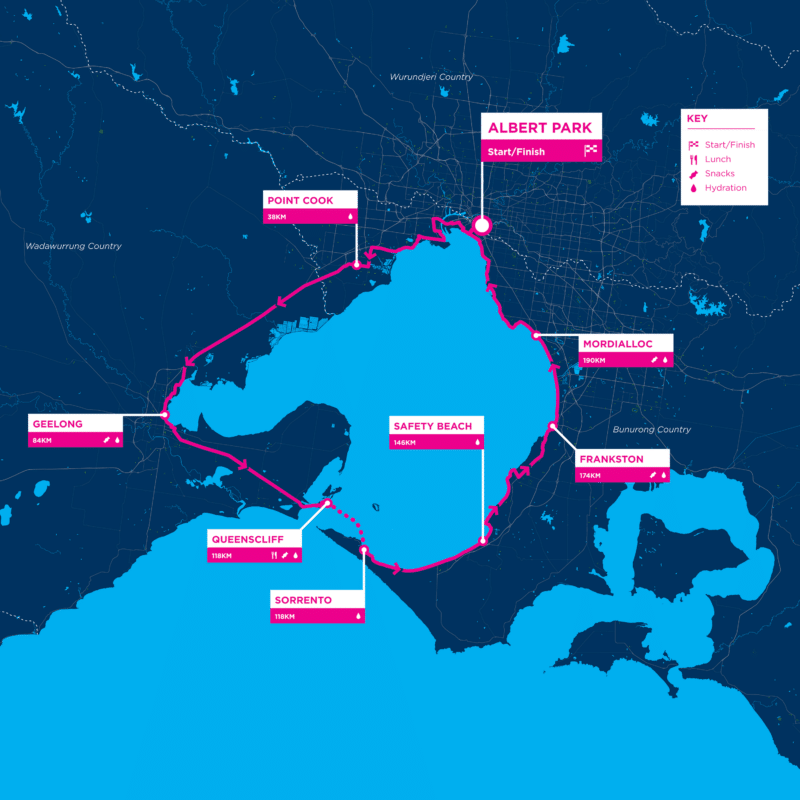 Starting and finishing in Melbounre, Around The Bay is a very popular annual event that sees thousands of cyclists take on the challenge of riding a 220km loop around entire Port Phillip Bay coastline, returning along the famous Beach Road. It’s relatively flat overall, but still a long way to ride! There are shorter options, but none of those are a full loop.