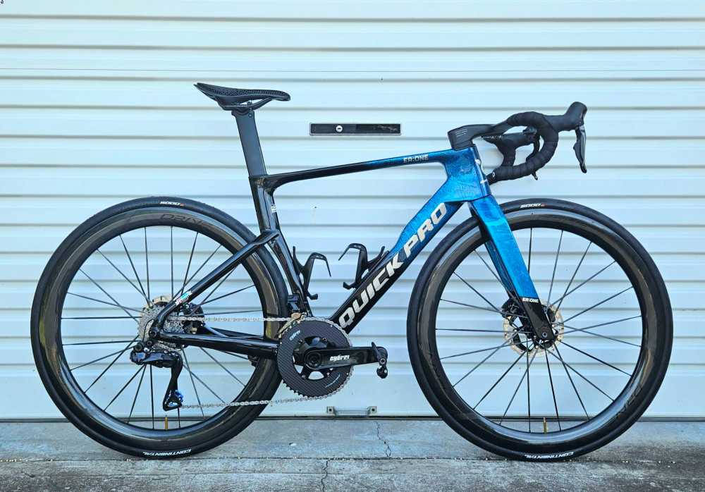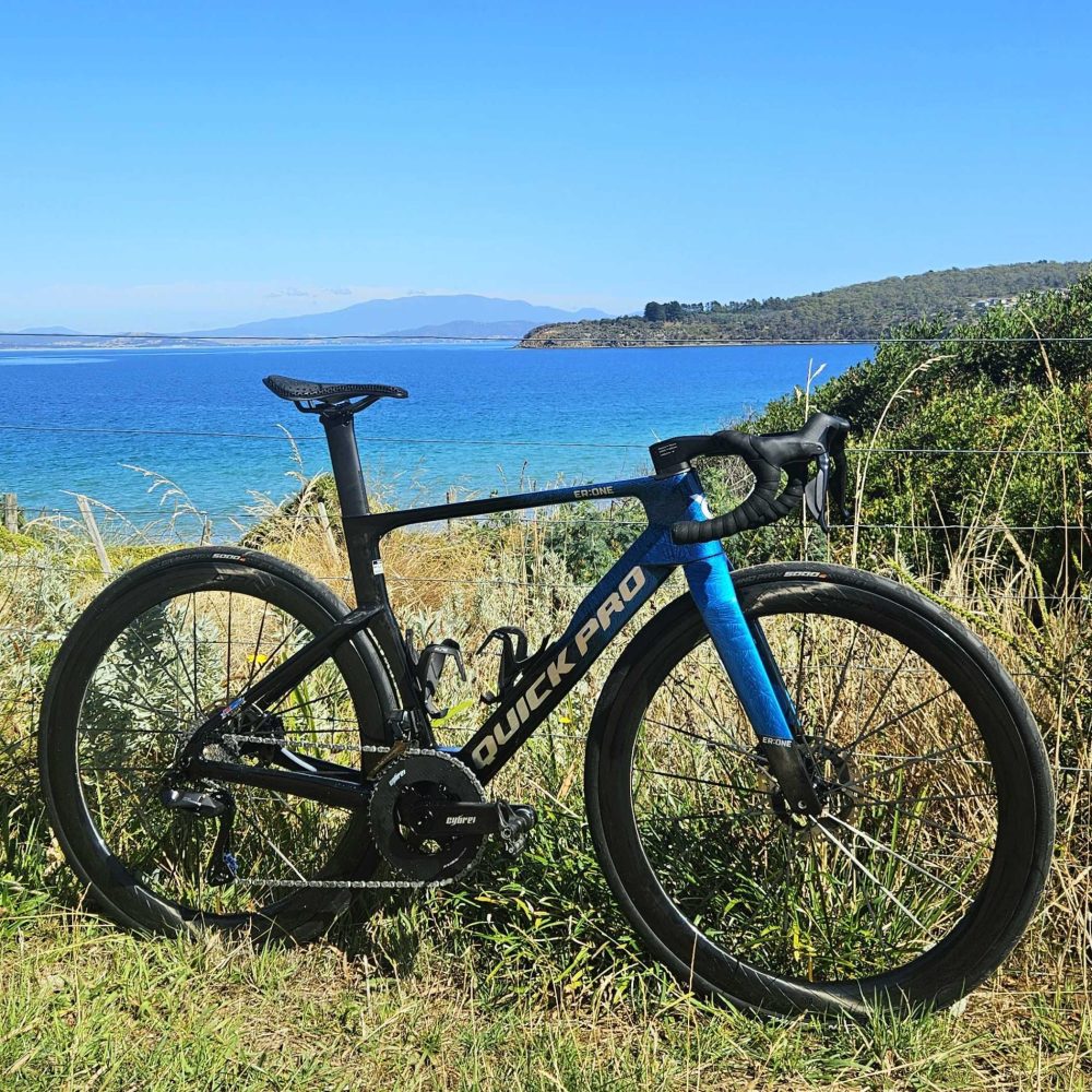 I’m a small guy so the medium frame worked perfectly for me. I have a single 10mm spacer under the 38cm/100mm integrated bars. Speaking of the bars, running the internal hydraulic cabling was the hardest part of the build. Cable guides are included, but it’s a tight one. Apart from that, building the bike with the CYBREI carbon crankset, Shimano 12-speed Di2, Elite wheels, and a bunch of other Chinese sourced parts was a breeze. The build quality of the frameset is insane.